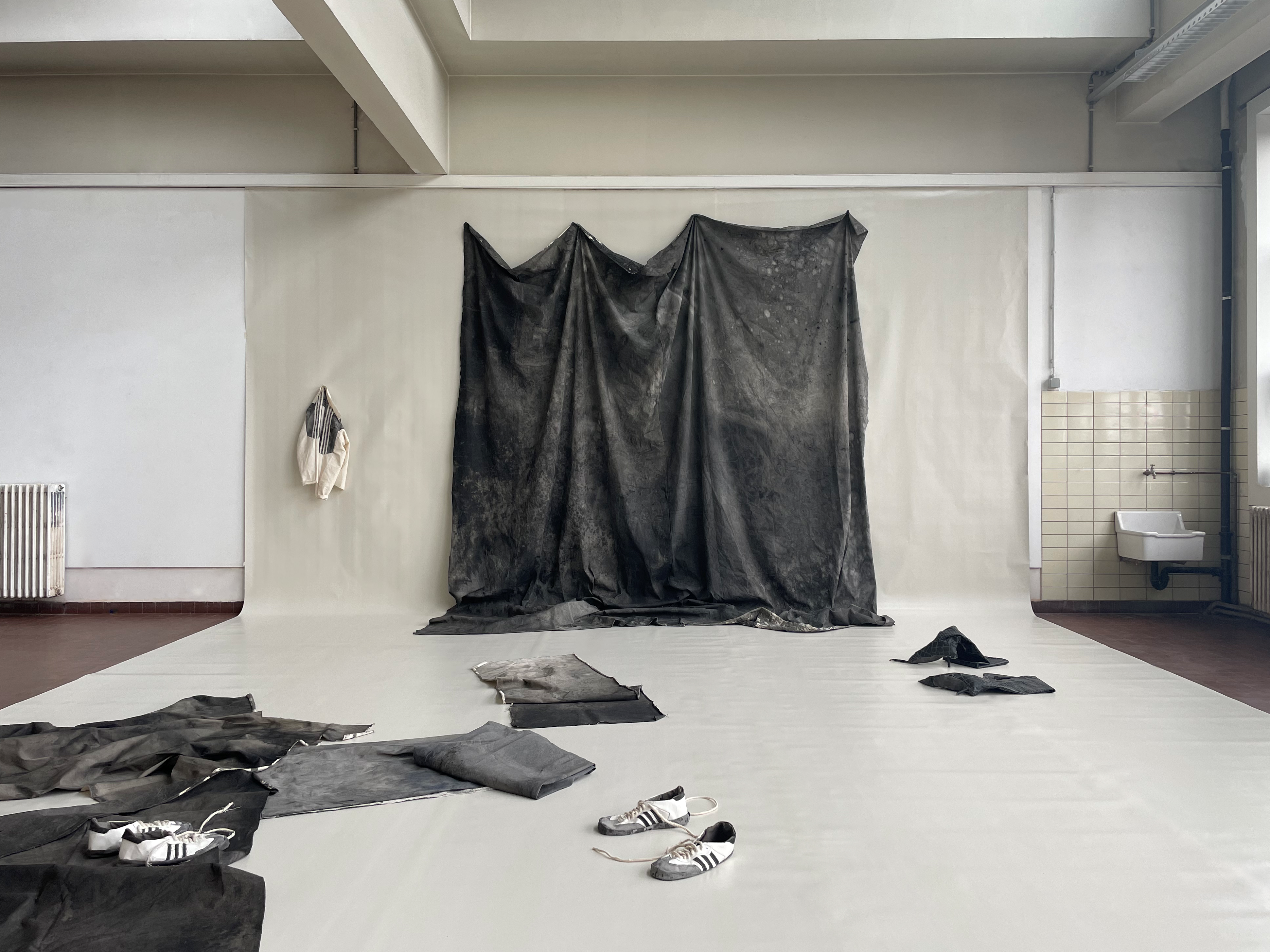 ENDE IN SICHT 2021, graphite and colour pencil on paper, textile, charcoal, wood, stones, paint, dimensions variable